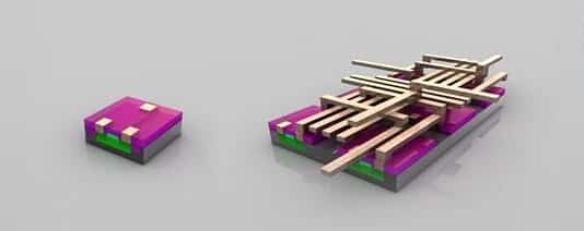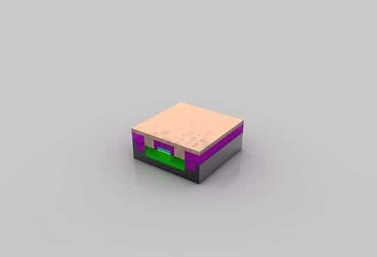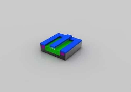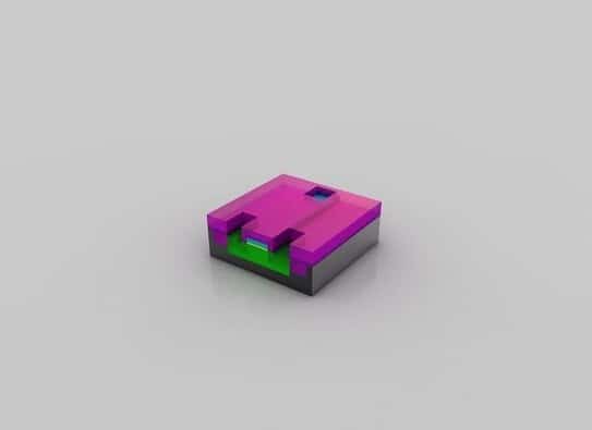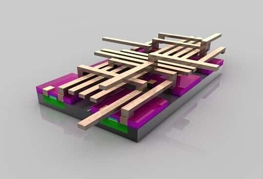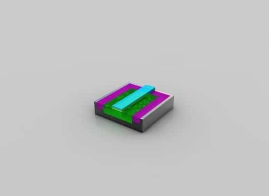 晶體管就緒:至此,晶體管已經(jīng)基本完成。在絕緣材(品紅色)上蝕刻出三個孔洞,并填充銅,以便和其它晶體管互連。