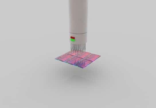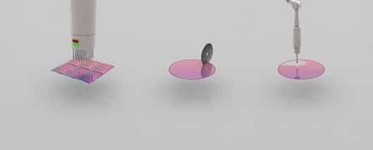 晶圓測試:內(nèi)核級別,大約10毫米/0.5英寸。圖中是晶圓的局部,正在接受第一次功能性測試,使用參考電路圖案和每一塊芯片進(jìn)行對比。