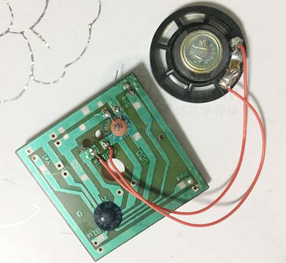 2,語(yǔ)音芯片電路中正負(fù)極的104電容(0.1uF),除極少數(shù)簡(jiǎn)易功能芯片在紐扣電池4.5V以下供電時(shí),都不能省去,否則會(huì)引發(fā)不發(fā)聲音,聲音中斷,雜音等不良情況。