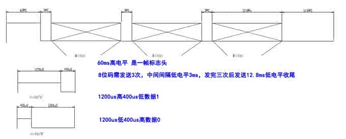 同一命令,也就是同一個命令發(fā)3 次,以下的波形代表一個完整的命令,1200us高+400us為1,400us高+1200us為0, 8位碼需發(fā)送3次,中間間隔低電平3ms,發(fā)完三次后發(fā)送12.8ms低電平收尾 )