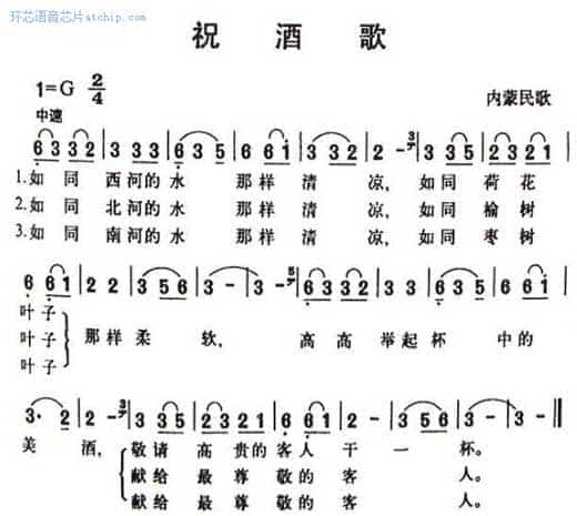 | 祝酒歌為一種或者一類歌曲的總稱。常用在喜慶的場合及歡迎的宴會上,是一種用以祝酒、勸酒、表達美好祝愿及敬意的歌曲。各民族、各地區(qū)幾乎都有祝酒歌,全國的祝酒歌可以說不計其數(shù)。 |