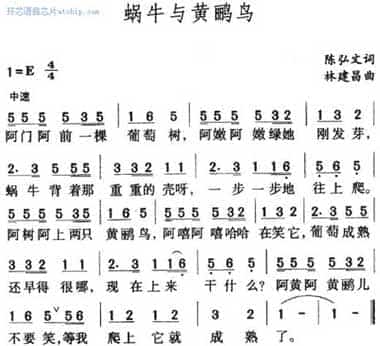 《蝸牛與黃鸝鳥》是一首流行于臺(tái)灣的敘事性民歌,歌詞以敘述者的口吻,講述了蝸牛在葡萄樹剛發(fā)芽的時(shí)候就背著重重的殼往上爬,ATChip.com而黃鸝鳥在一旁譏笑它的有趣情景。歌曲歌頌了蝸牛堅(jiān)持不懈的進(jìn)取精神。由陳弘文作詞、左宏元作曲。采用2/4拍,五聲徵調(diào)式,一段體結(jié)構(gòu)。